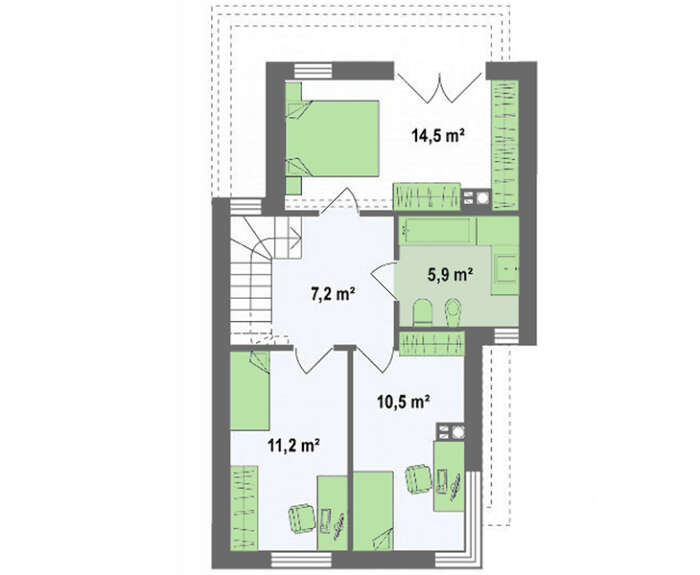 Личное пространство жильцов размещено на верхнем этаже, где находится три спальни и общий санузел.