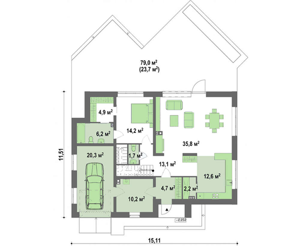 Проект содержит три раздела – АрхитектурныйКонструктивный и Инженерный: водоснабжение, отопление, вентиляция, канализация, электроснабжение (приобретается за дополнительную плату) + Пояснительная записка.