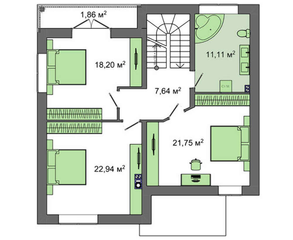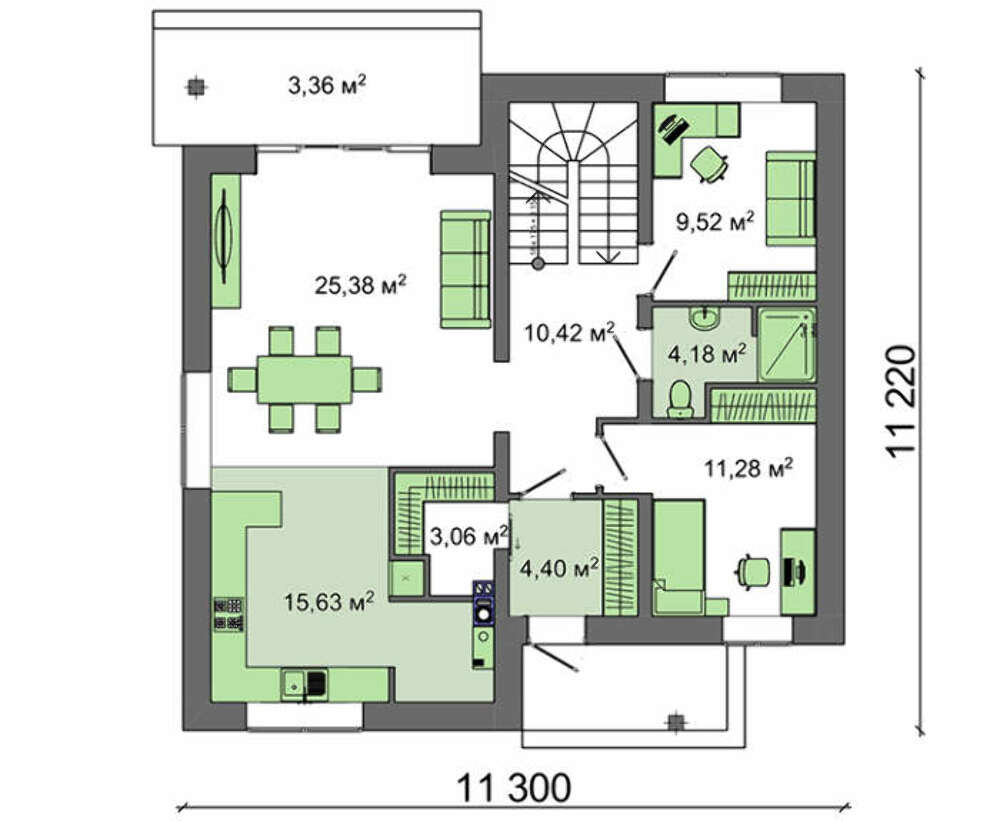 Проект содержит три раздела – Архитектурный, Конструктивный и Инженерный: водоснабжение, отопление, вентиляция, канализация, электроснабжение (приобретается за дополнительную плату) + Пояснительная записка.