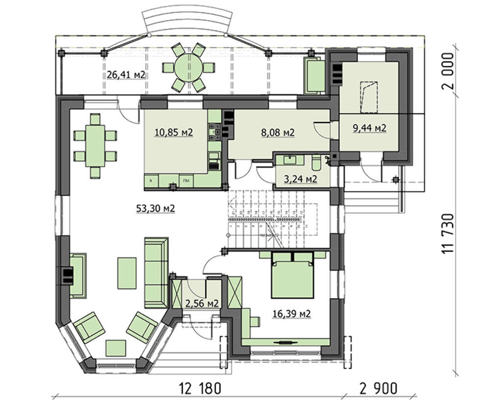 Проект содержит три раздела – Архитектурный, Конструктивный и Инженерный: водоснабжение, отопление, вентиляция, канализация, электроснабжение (приобретается за дополнительную плату) + Пояснительная записка.