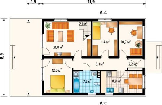 Проект содержит три раздела – АрхитектурныйКонструктивный и Инженерный: водоснабжение, отопление, вентиляция, канализация, электроснабжение (приобретается за дополнительную плату) + Пояснительная записка.