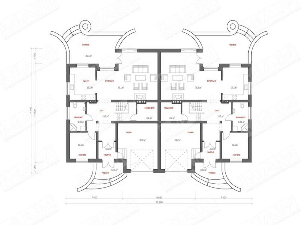 Проект содержит три раздела – Архитектурный, Конструктивный и Инженерный: водоснабжение, отопление, вентиляция, канализация, электроснабжение (приобретается за дополнительную плату) + Пояснительная записка.