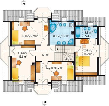 Обилие места для встреч гостей никак не ущемляет проживающих. В их распоряжение отдано пять индивидуальных помещений. Назначение уединенной комнаты на первом этаже жильцы могут определить самостоятельно, отдав ее под детские игры, спальню старшего члена семьи или уютный кабинет. Хорошо реализовано в планировке комнат второго этажа законное желание каждого человека иметь свою личную жизнь. Все спальни выходят на разные части света и продолжаются в индивидуальных балкончиках. Здесь удобно мечтать, встречать закаты и рассветы, а также слушать серенады, предназначенные только тебе.