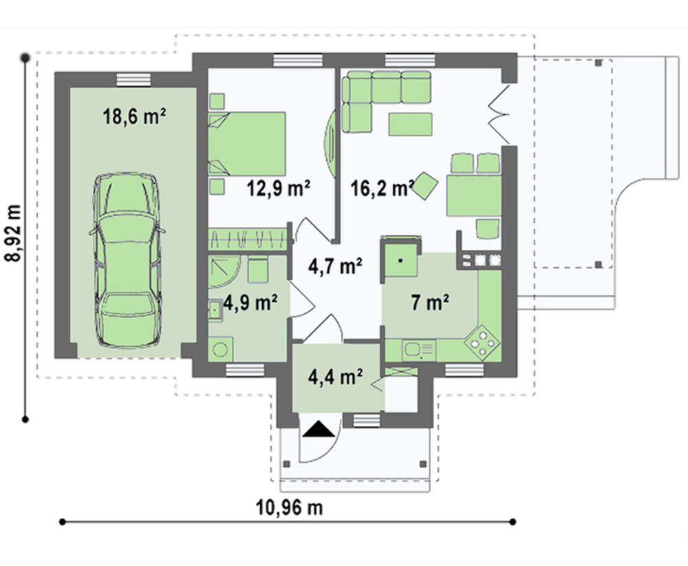 Проект дачного домика придется по душе застройщику, предпочитающего активный летний отдых на природе с комфортом и благами цивилизации. Коттедж небольшой, рассчитан на проживание семьи из двух человек – прекрасное приобретение для молодой пары или четы старшего поколения. Площадь дома 68 кв. м, включает все необходимое для сезонного проживания. Архитектура коттеджа выполнена в европейском стиле, что означает практичность и рациональность.