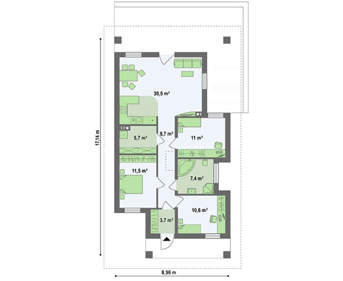 Проект компактного одноэтажного коттеджа станет удачным приобретением для строительства дачи или загородной резиденции. Габариты дома позволят поместить его на небольшом участке любой формы, а высокий функционал обеспечит комфортный отдых. Симпатичный и стильный экстерьер в традициях европейской архитектуры не только идеально впишется в колоритный пейзаж, но и вызовет одобрение у друзей и соседей.