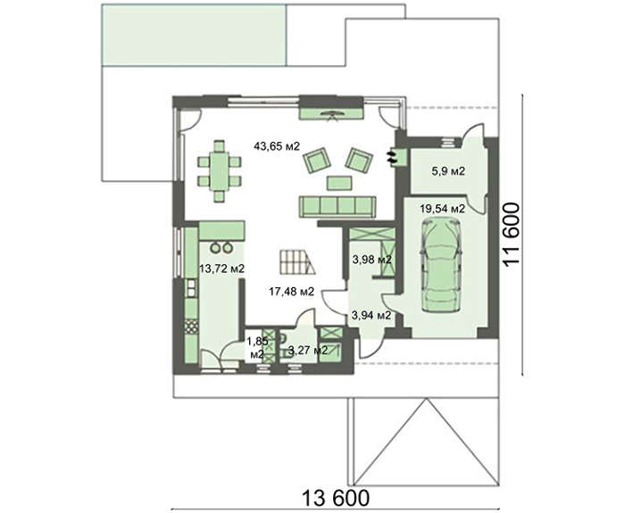 Гордостью современного коттеджа стал летний сад, размещённый на крыше гаража. Здесь среди благоухающей зелени можно выпить чашечку утреннего кофе или устроить ужин при свечах. Для отдыха в зимнее время предусмотрено теплое помещение с панорамными окнами для созерцания красивого пейзажа.