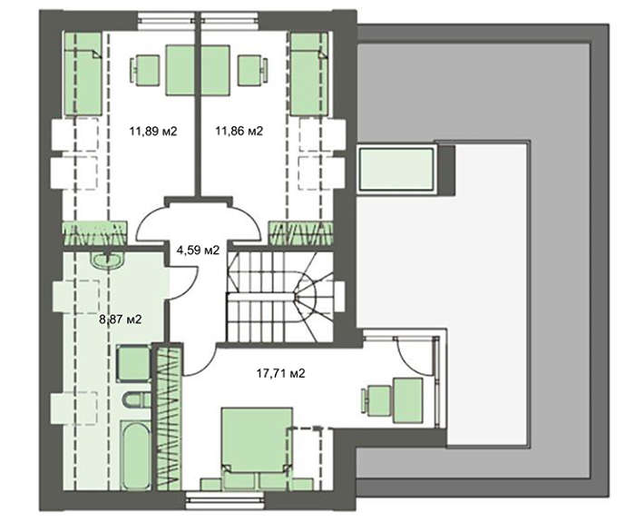 Второй этаж включают две одинаковых спальни, апартаменты хозяина с выходом в летний сад, и просторную ванную комнату.