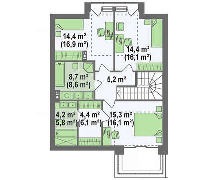 Разделение двух квартир выполнено по линии гаража, что гарантирует максимальную звукоизоляцию. Все личные комнаты вынесены на второй этаж. Из них особого внимания заслуживают апартаменты хозяина. Они имеют солидную площадь, просторный гардероб позволяет хранить значительные запасы вещей. Имеется индивидуальный санузел, здесь бесконечно долго можно принимать водные процедуры. На две квартиры предусмотрен общий балкон, где друзья смогут устраивать совместные чаепития.