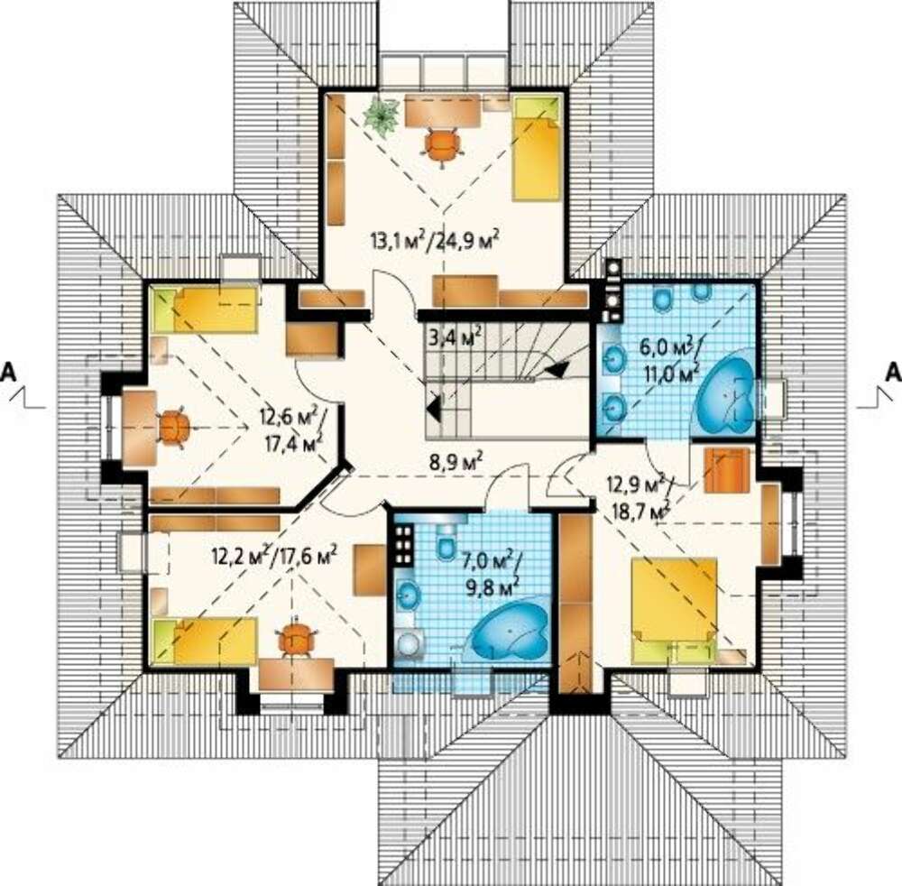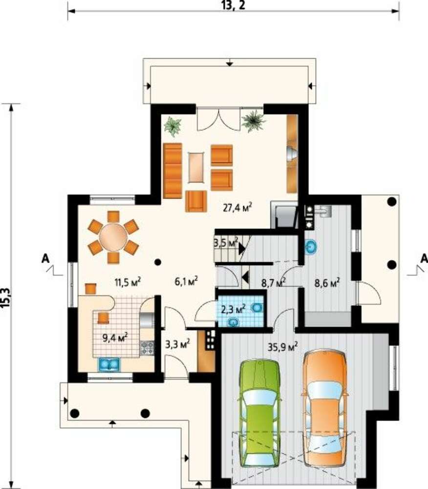 Отличные возможности открывает для своих жильцов коттедж с шестью комнатами и гаражом на две машины. Его особенность в значительных размерах места, выделенного под автопроблемы, и количеством спальных помещений, предусмотренных для большой семьи. Несмотря на внешне простой фасад, для украшения которого использованы приятные для глаза колера натуральной древесины, четко очерченные, выполненные в лаконичной расцветке, колонны, строение выигрывает и зажигается новыми тонами за счет большой красочной крыши, удивляющей окружающих своими необычными формами и габаритами.