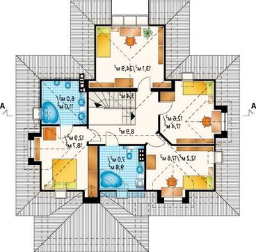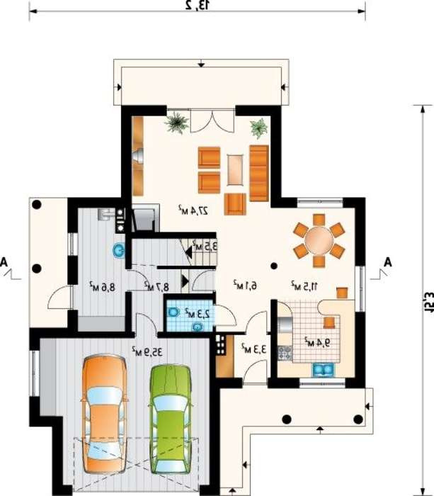 Отличные возможности открывает для своих жильцов коттедж с шестью комнатами и гаражом на две машины. Его особенность в значительных размерах места, выделенного под автопроблемы, и количеством спальных помещений, предусмотренных для большой семьи. Несмотря на внешне простой фасад, для украшения которого использованы приятные для глаза колера натуральной древесины, четко очерченные, выполненные в лаконичной расцветке, колонны, строение выигрывает и зажигается новыми тонами за счет большой красочной крыши, удивляющей окружающих своими необычными формами и габаритами.