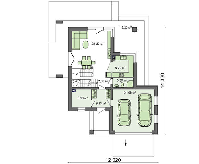Предусмотрен выход из гостиной прямо на загородную территорию. Приглашённые гости имеют возможность свободно подвигаться из внутреннего пространства на террасу. Разместив на приусадебном участке лавочки и беседки, оборудовав детскую зону и рассадив по природной территории цветы, можно большую часть встречи родственников и приятелей проводить на свежем воздухе.