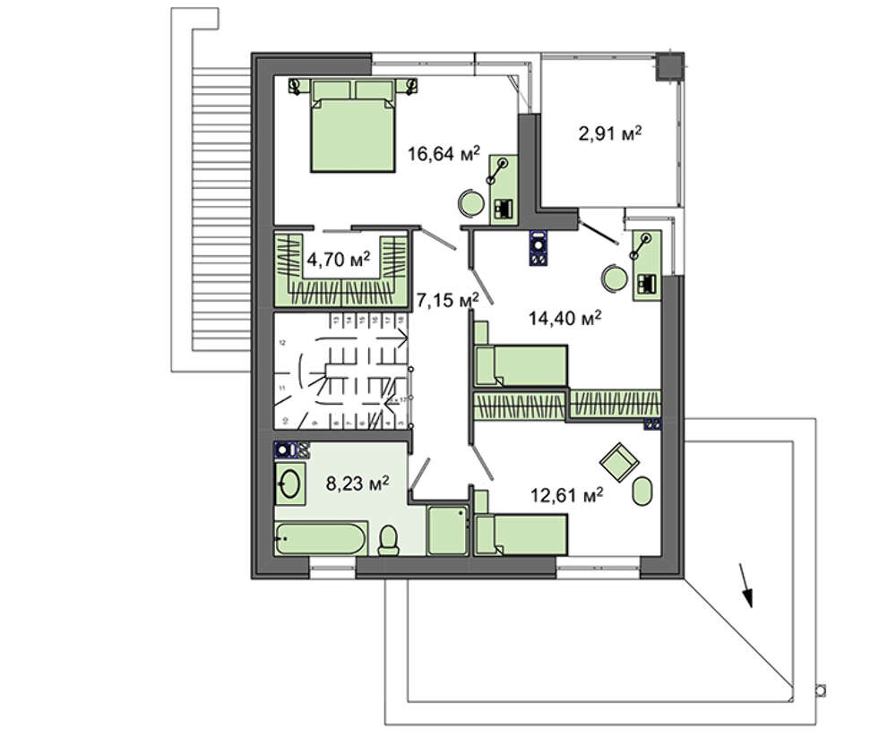 Личные апартаменты расположены на втором этаже. Три изолированные комнаты отличаются между собой размерами, что дает домовладельцам возможность выбора. Особенность второго этажа в обширном помещении для санитарных мероприятий. Его площадь рассчитана на расположение самого современного оборудования для приема водных процедур.