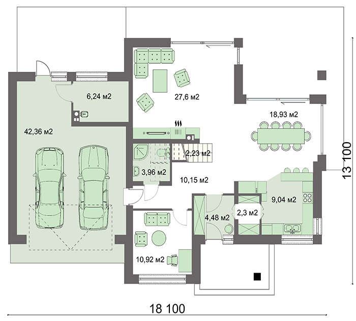 Первый этаж рассчитан на совместное проведение времени всеми членами семьи. Гараж свободно вместит два автомобиля. Здесь же имеется мастерская для выполнения ремонтных работ. Для отдыха и хранения гардероба предусмотрены отдельные комнаты. За счет слияния столовой и гостиной получено объемное помещение для совместных развлечений, наполненное светом и простором. Вынесение обеденного стола в эркер позволяет проводить прием пищи в роскошной природной обстановке.