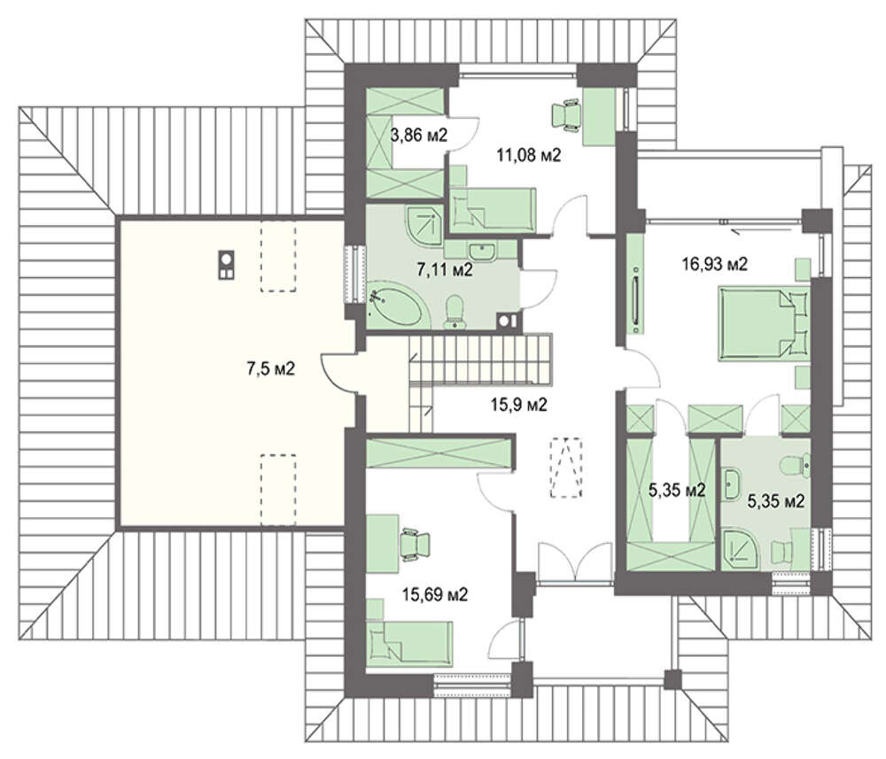 Большие, практически на всю площадь стен, окна наполняют комнаты светом, создают праздничное настроение и соответствуют современным архитектурным направлениям. В проекте предусмотрено три спальных помещения. Они размещены на тихом втором этаже, отличаются планировкой и размерами. Могут включать собственный санузел и гардероб, иметь выход на балкон.