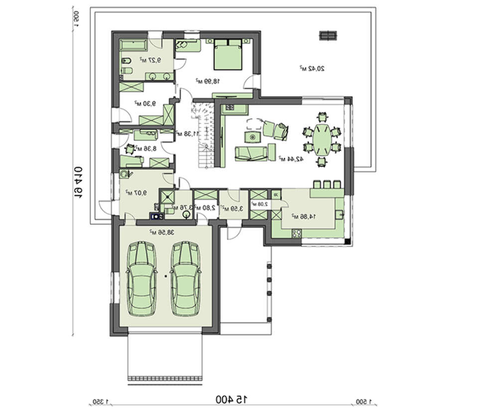 Особенность планировки первого этажа в личных департаментах, под кровом которых скрывается спальня, собственный санузел и гардеробная. Такие помещения часто отдают старшему поколению, обособленность и уют — их особая фишка. На первом этаже имеется отдельная комната под кабинет и встроенный гараж, площадь которого рассчитана на два автомобиля.