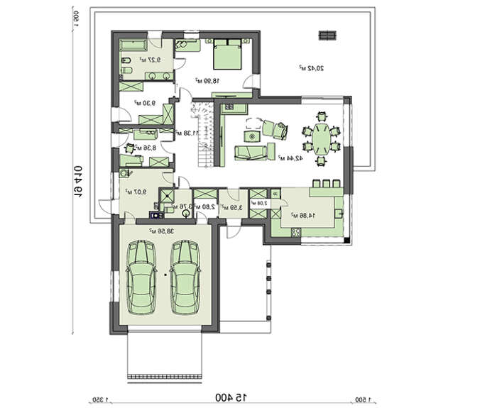 Планировка жилого дома тщательно продумана. Здесь найдено место для комнат разного назначения. Зона отдыха получена за счет слияния кухни, столовой и гостиной. Примыкающая кладовая справится с хранением съестных припасов и бытовой техники.
