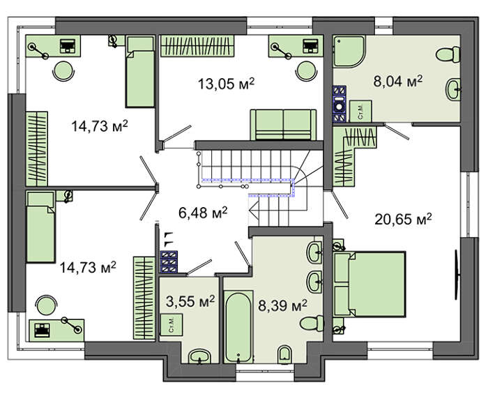 Проект содержит три раздела – Архитектурный, Конструктивный и Инженерный: водоснабжение, отопление, вентиляция, канализация, электроснабжение (приобретается за дополнительную плату) + Пояснительная записка.
