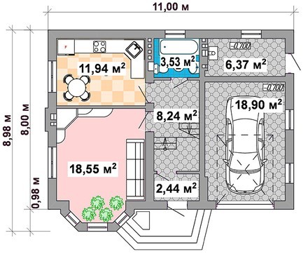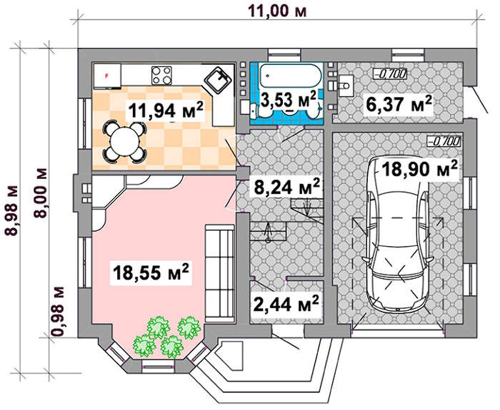 Встроенный гараж на 1 автомобиль позволяет хозяину хранить транспорт и обслуживать его в комфортных условиях. Небольшая топочная может быть дополнительно оборудована под домашнюю мастерскую.