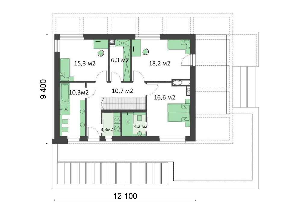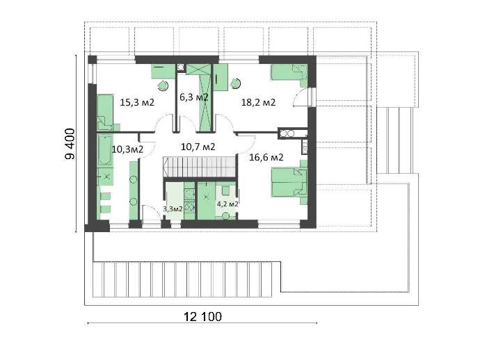 Особенность двухэтажного дома в больших террасах и верандах. Их громадные площади позволяют жильцам и многочисленным гостям проводить время на свежем воздухе, под птичьи трели устраивать пышные застолья, вдыхать перемешанные с запахами шашлыка ароматы роз.