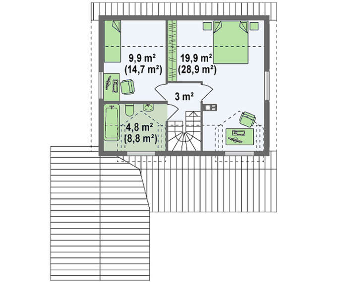 Компактный дом понравится застройщикам, предпочитающим деревянное зодчество. И хотя стены здания выложены из газобетонных блоков, а в качестве финишного покрытия использована металлическая черепица, коттедж не уступает по экологичности и натуральности финским домикам или русским избам. Все поверхности стен и фронтонов покрыты древесиной, стропильная система, входной портал и навес над ним выполнены из дерева. Несмотря на небольшие габариты, дом отвечает всем современным требованиям благоустроенного жилья. Проект одинаково популярен как в строительстве дачных домиков, так и полноценных коттеджей для круглогодичного проживания.