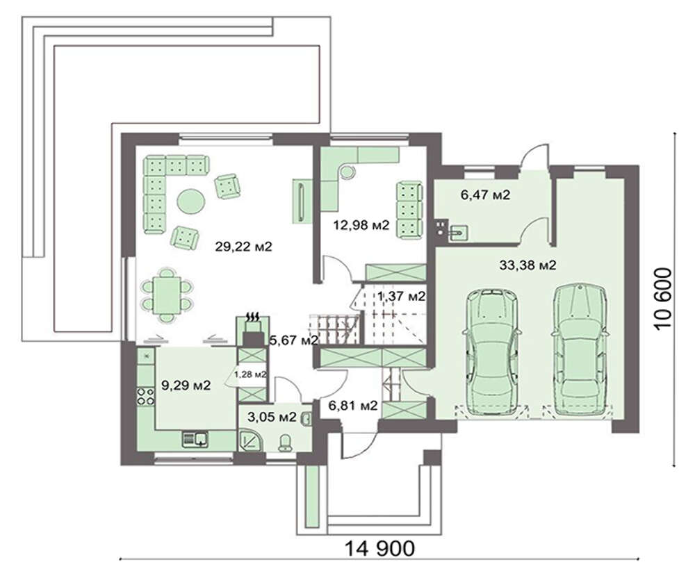 Проект первого этажа состоит из двух частей. В просторный гараж площадью более 30 квадратов помещается два автомобиля. Большие габариты оставлены для мастерской. Жилая зона состоит из гостиной и кабинета. Размеры последнего дают возможность разместить здесь апартаменты старшего поколения.