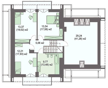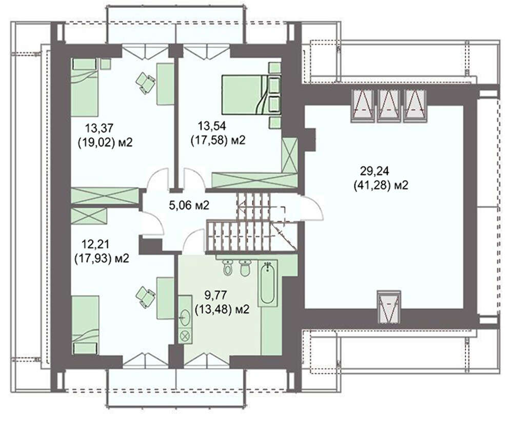 Зона отдыха соединяет кухню, столовую и гостиную. Кухню от жилого пространства отделяет камин. Такое размещение гарантирует отсутствие пищевых запахов в комнат отдыха. Три спальни расположены на втором этаже. Практически одинаковой компоновки, они все имеют выходы на балкон. Планировка расширяет жилое пространство и позволяет часть времени проводить на свежем воздухе, любоваться красотою цветущих растений и вдыхать ароматы свежескошенной зелени.