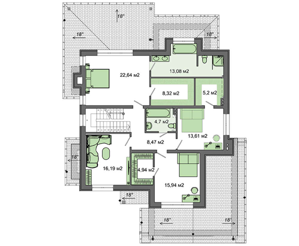 Отдельная комната на первом этаже может иметь разное назначение, здесь можно поместить спальню для старших членов семьи, или кабинет хозяина. Второй уровень представлен четырьмя личными апартаментами. Спальня владельца дома включает два дополнительных помещения: гардероб и просторный санузел необычной формы. Эркерная часть предназначается для ванной, такая компоновка поможет превратить водные процедуры в шикарный ритуал.