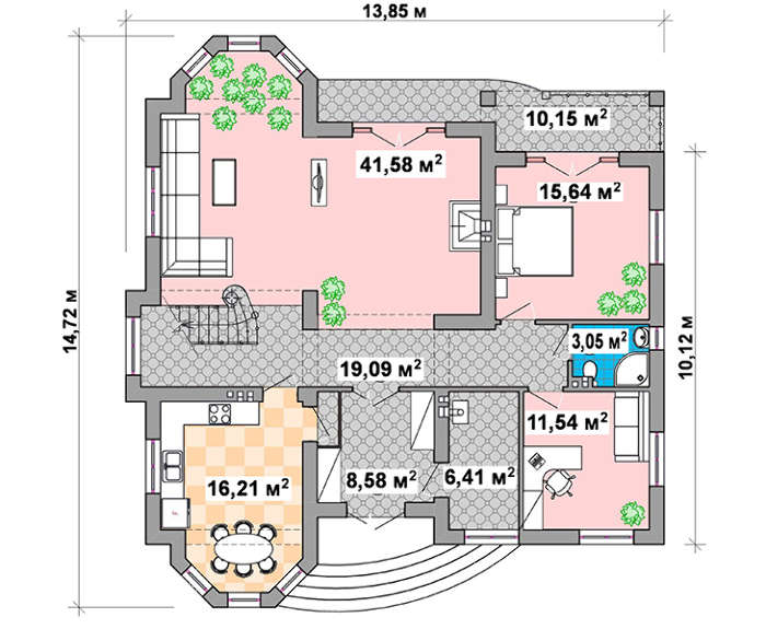 Внутреннее пространство можно условно разделить на две зоны: дневную и ночную. Первая располагается на нижнем уровне и включает:
