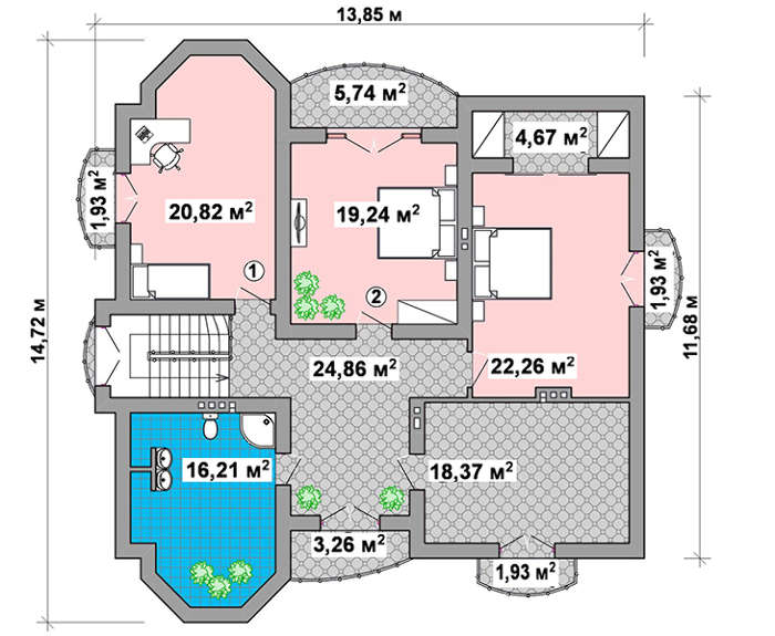 Верхний уровень предполагает ночное времяпрепровождение. Здесь находится большой холл, три спальни различной площади с балконами. В апартаментах хозяина предусмотрена гардеробная комната. На этаже располагается совмещенный санузел с большой угловой ванной типа джакузи, и биллиардная с балконом.