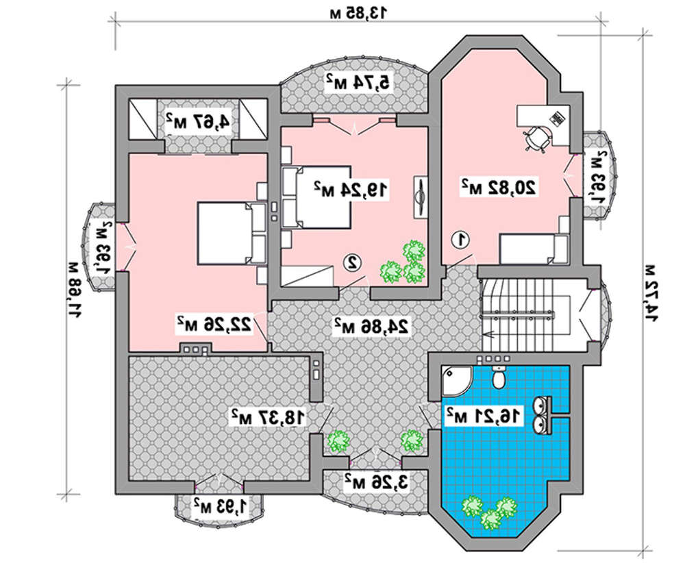 Верхний уровень предполагает ночное времяпрепровождение. Здесь находится большой холл, три спальни различной площади с балконами. В апартаментах хозяина предусмотрена гардеробная комната. На этаже располагается совмещенный санузел с большой угловой ванной типа джакузи, и биллиардная с балконом.