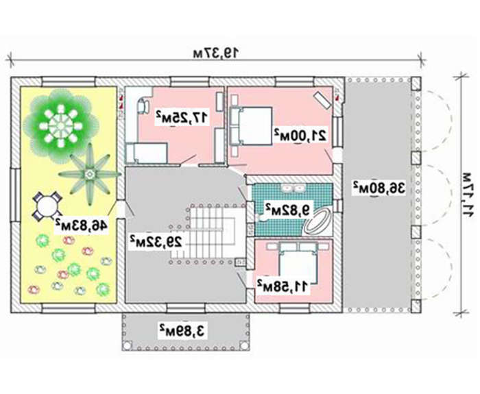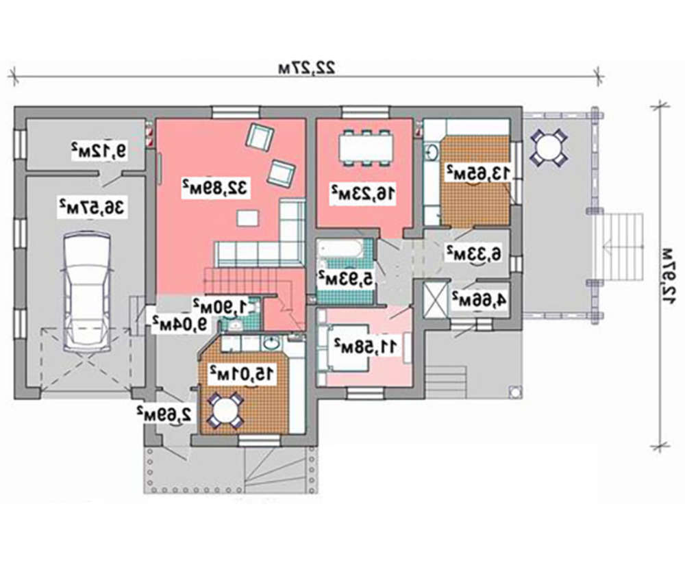 Наружному великолепию соответствует уникальная планировка. Жилой дом разделен на две неравные части. Первая большая раскинулась на два этажа. Под просторный гараж отдано почти 40 квадратов. Здесь достаточно места, чтобы не только хранить автомобиль, но и с комфортом его ремонтировать. Для отдыха можно использовать отдельную спальню, 10 кв. м вполне достаточно.