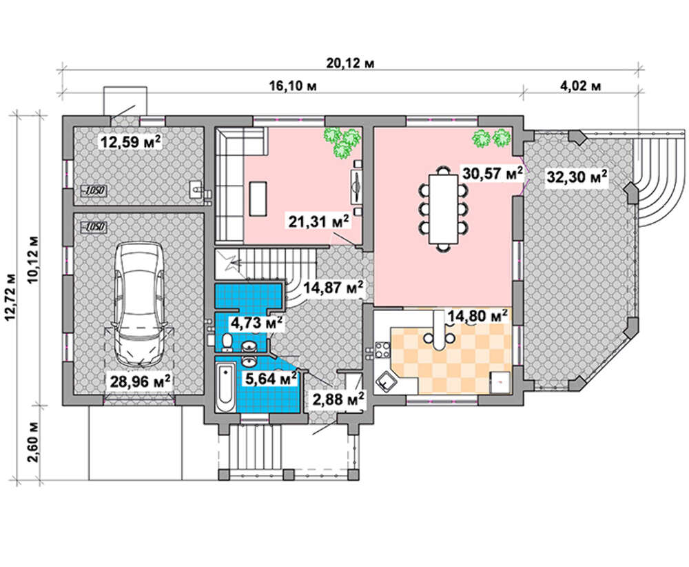 В этом доме все помещения комфортные и большие. Площадь встроенного гаража позволяет не только хранить одну единицу авто, но и с комфортом выполнять ее обслуживание. Помещение топочной дополнительно может использоваться под мастерскую.