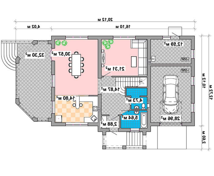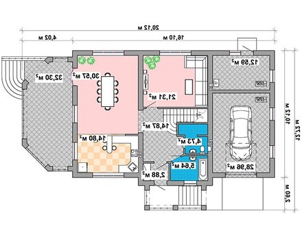В этом доме все помещения комфортные и большие. Площадь встроенного гаража позволяет не только хранить одну единицу авто, но и с комфортом выполнять ее обслуживание. Помещение топочной дополнительно может использоваться под мастерскую.