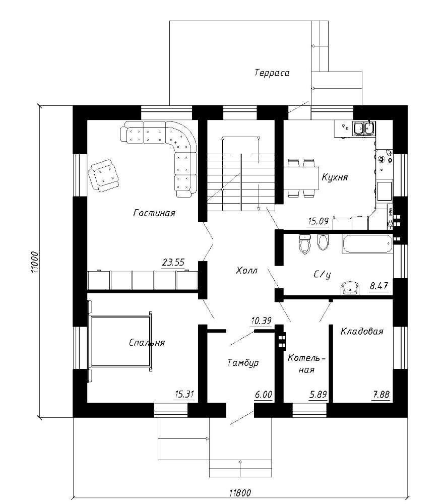Проект содержит три раздела – АрхитектурныйКонструктивный и Инженерный: водоснабжение, отопление, вентиляция, канализация, электроснабжение (приобретается за дополнительную плату) + Пояснительная записка.