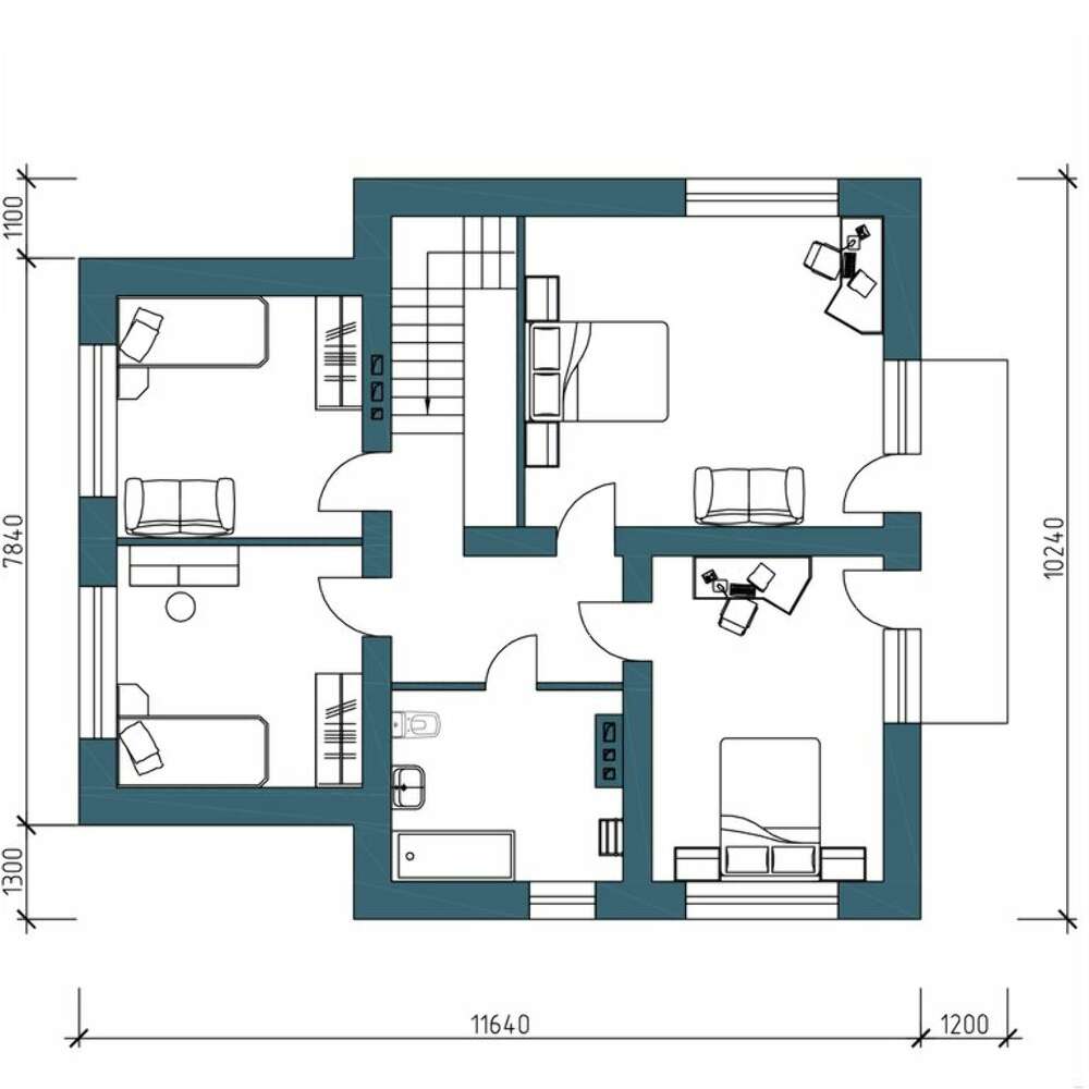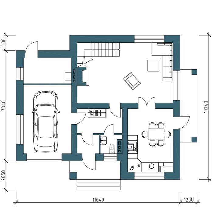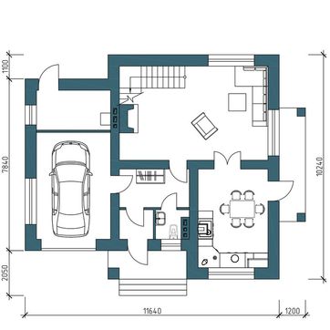 В планировке первого этажа предусмотрены все помещения, необходимые для создания комфортных условий. Гараж рассчитан на хранение одной единицы транспорта. Прилегающее помещение топочной может быть использовано для размещения склада или мастерской. Под гостиную выделена отдельная площадь с выходом на террасу и далее на загородную территорию. Действующий камин добавляет уюта и душевности, обогревает прилегающую площадь. Столовая предусмотрительно объединена с кухней, что упрощает хлопоты хозяйки. Она получает возможность готовить вкусные блюда, сервировать столы и контролировать все события.