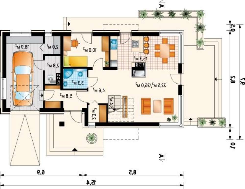 Интересно выполненному внешнему оформлению соответствует столь же оригинально решенная внутренняя планировка. В пространстве первого этажа помимо гостевой комнаты студии, предусмотрено гаражное помещение. Габариты дополнительных апартаментов — мастерской рассчитаны на хранение инструмента и выполнение сервисных работ. Для того чтобы проживание представителей старшего поколения обеспечить высшим комфортом предусмотрена небольшая комната на нижнем этаже. При желании ее легко превратить как в детскую, так и бизнес-кабинет. Гостевая зона организована в студию. Вокруг размещенного в центре горницы камина собраны все необходимые для встречи родственников и друзей зоны, из каждой предусмотрен собственный выход на загородный простор. Сопряжение столовой и кухни упрощает хозяйские хлопоты, а правильно организованная вентиляция не допустит навязчивые запахи пищи на жилую часть  территорию.