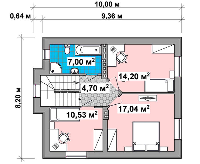 Все спальни, а их три, расположены на втором этаже. Комнаты имеют разную планировку, отличаются габаритами и площадью. Каждый из членов семьи получает возможность подобрать спальню под свои потребности. Простора санузла достаточно для размещения самого прогрессивного сантехнического оборудования.
