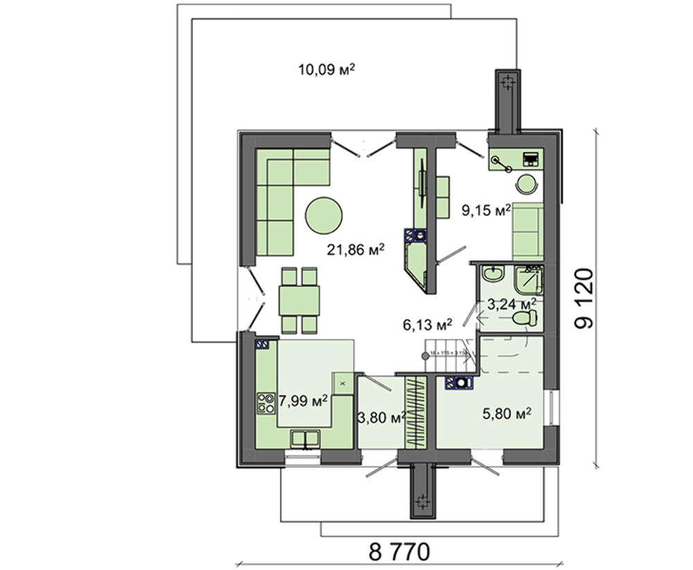 Несмотря на то что кухня включена в простор гостиной, для ее расположения выбрано отдаленное место, что помогает сконцентрировать пищевые запахи в отведенном пространстве.