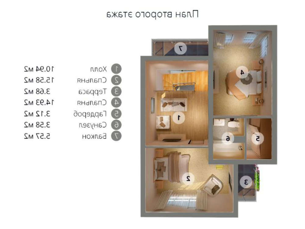 Второй этаж - это личная территория жильцов дома. Здесь находятся две спальни по 15 кв. м разной комфортности, санузел и холл 10 кв. м.