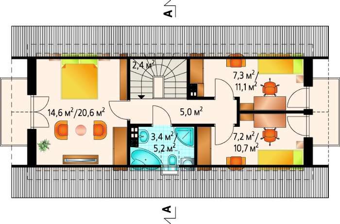 Во внутреннем пространстве предусмотрено четыре спальные комнаты. Одна из них выполнена на первом этаже, при желании ее легко можно превратить в деловой кабинет или апартаменты для детей. Спальни второго этажа имеют уютные балконы, размеры которых позволяют использовать их для чаепитий и исполнения наполненных романтикой серенад.