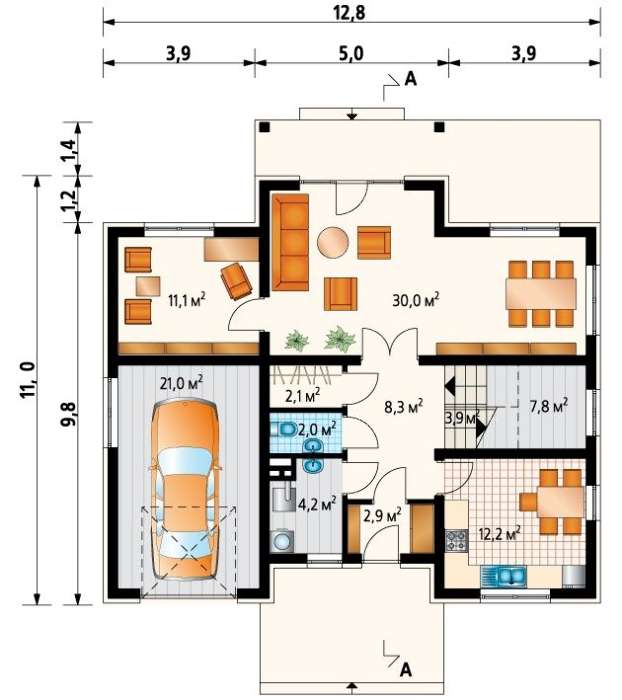 Пространство первого этажа рассчитано на помещения разного функционального назначения. Гараж легко решает проблему хранения транспортного средства, у жильцов нет необходимости в постройке на участке дополнительного сооружения.
