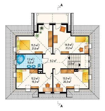 Второй этаж поделен на четыре спальных помещения. Две комнаты имеют личное балконное пространство, дают возможность своих хозяев получать радость от общения на природе, свежего воздуха и романтического времяпрепровождения.