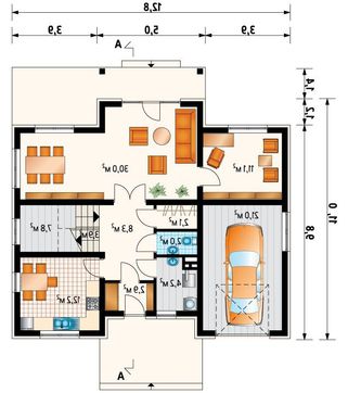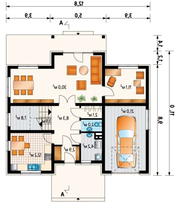 Пространство первого этажа рассчитано на помещения разного функционального назначения. Гараж легко решает проблему хранения транспортного средства, у жильцов нет необходимости в постройке на участке дополнительного сооружения.