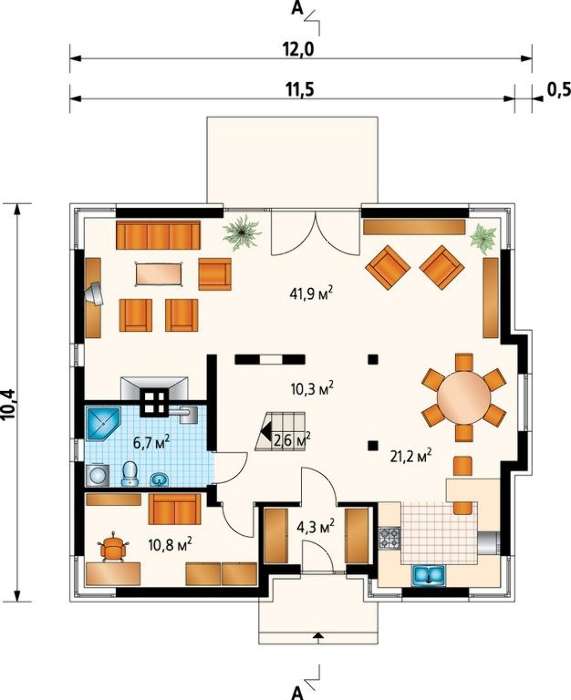 Элегантное строение рассчитано на проживание дружелюбной семьи. Основное пространство первого этажа отдано для гостиной. Обширное помещение включает в себя три разнесенные в разные углы зоны. В наполненный простором и солнечным светом эркер помещен обеденный стол, такая планировка помогает создавать хорошее настроение на время приема пищи. Свой выход на загородный участок раздвигает границы комнаты на весь приусадебный простор. Жильцы и их гости могут большую часть встречи перенести на свежий воздух.