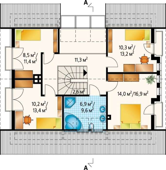 Пространство второго этажа рассчитаны на размещение необходимой для отдыха и личных занятий мебели. Все комнаты имеют выходы на индивидуальные балконы, что делает их более привлекательными для романтиков и мечтателей.