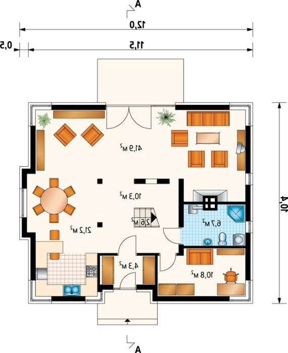 Элегантное строение рассчитано на проживание дружелюбной семьи. Основное пространство первого этажа отдано для гостиной. Обширное помещение включает в себя три разнесенные в разные углы зоны. В наполненный простором и солнечным светом эркер помещен обеденный стол, такая планировка помогает создавать хорошее настроение на время приема пищи. Свой выход на загородный участок раздвигает границы комнаты на весь приусадебный простор. Жильцы и их гости могут большую часть встречи перенести на свежий воздух.
