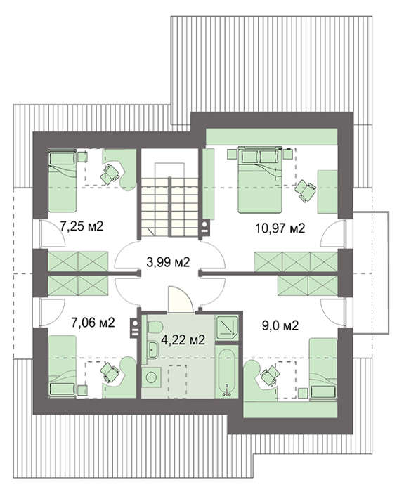 Благодаря рациональному разделению пространства найдено место для пяти личных комнат. Помещение первого этажа рекомендуется использовать под спальню для старшего поколения, представители которого не очень любят покорять лестничные пролеты. Четыре личные комнаты второго этажа имеют практические одинаковые размеры, что ставит хозяев в равные условия. Особенности спален в балконах, выход из которых есть со всех помещений.