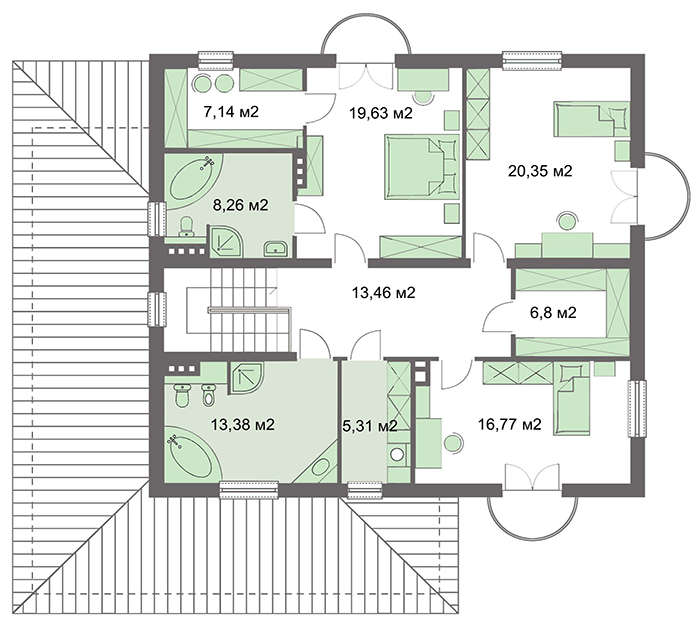 На втором этаже сосредоточены личные апартаменты хозяина дома с ванной  и гардеробом, две спальни остальных членов семьи. Имеется общий гардероб, ванная и прачечная.