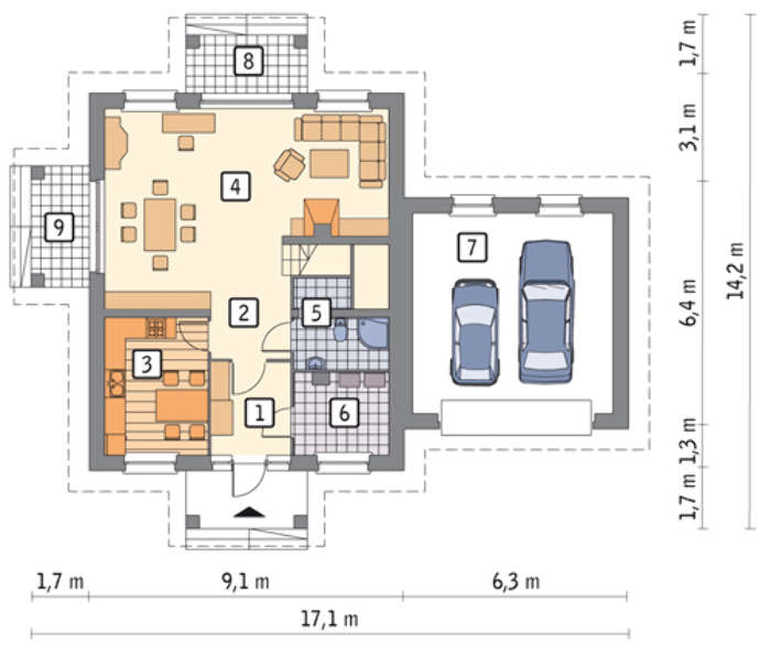 Проект содержит три раздела – АрхитектурныйКонструктивный и Инженерный: водоснабжение, отопление, вентиляция, канализация, электроснабжение (приобретается за дополнительную плату) + Пояснительная записка.