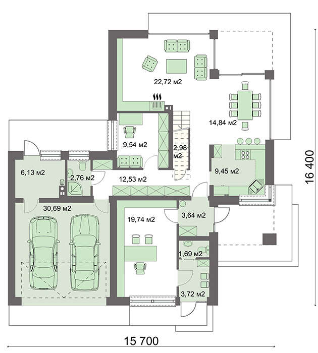 Первый этаж представлен помещениями разного назначения. Просторный гараж помогает защитить от атмосферных осадков две транспортные единицы. Имеется мастерская для выполнения работ по обслуживанию авто. Выделено место для отдыха, в небольшом помещении можно расслабиться, поговорить о важных делах, выпить чашечку кофе и аперитив в ожидании праздничного застолья.